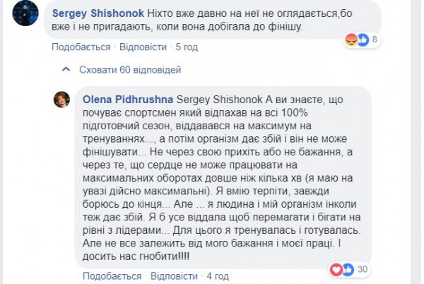 Украинская биатлонистка Елена Пидгрушной ответила на критику в свой адрес под одной из фотографий в Facebook, где один из болельщиков написал, что соперницы давно не оглядываются на спортсменку, потому что не помнят, когда она последний раз добегала финиша.