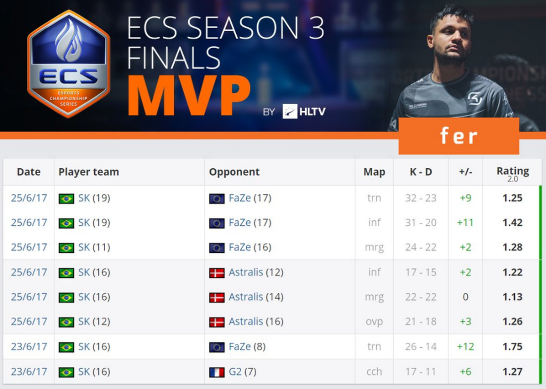 Портал HLTV.org признал Фернандо fer Альваренгу MVP третьего сезона ECS.