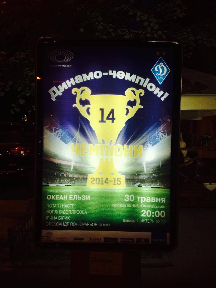 В субботу, 30 мая, Динамо в Киеве сыграет последний матч в сезоне, после чего отправиться праздновать завоеванное чемпионство на НСК Олимпийский, куда позвало всех своих болельщиков, разместив по городу афиши.